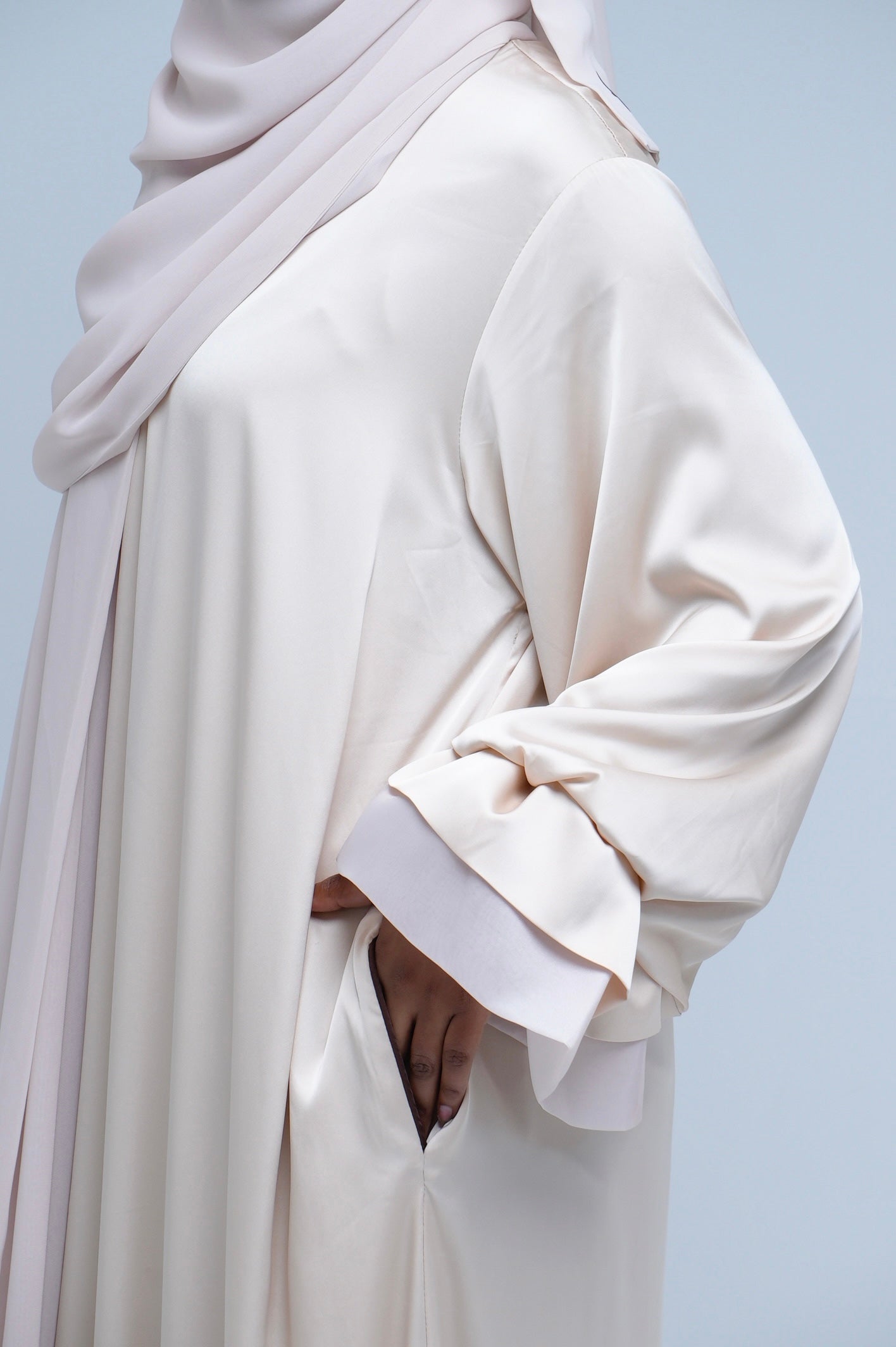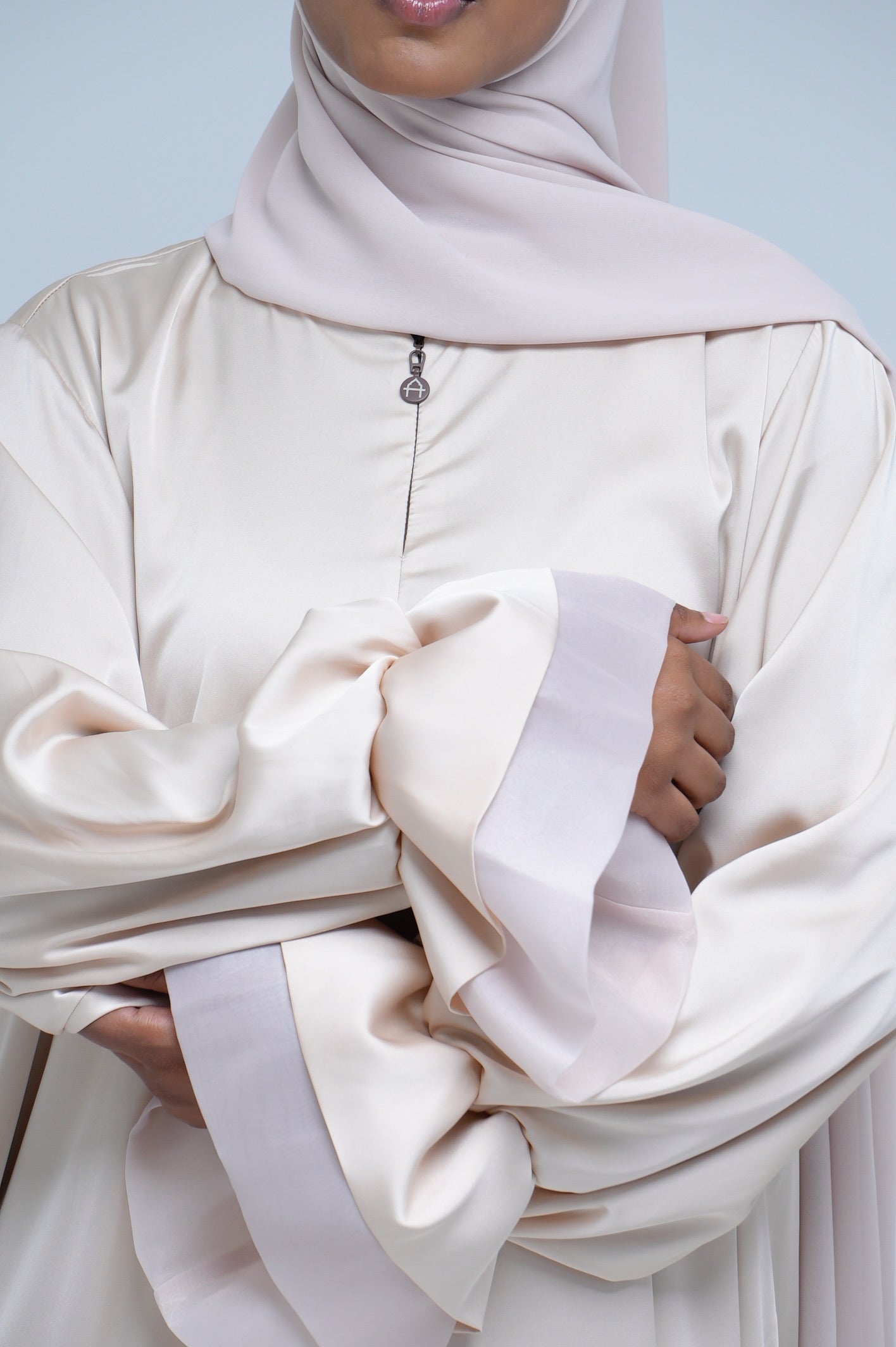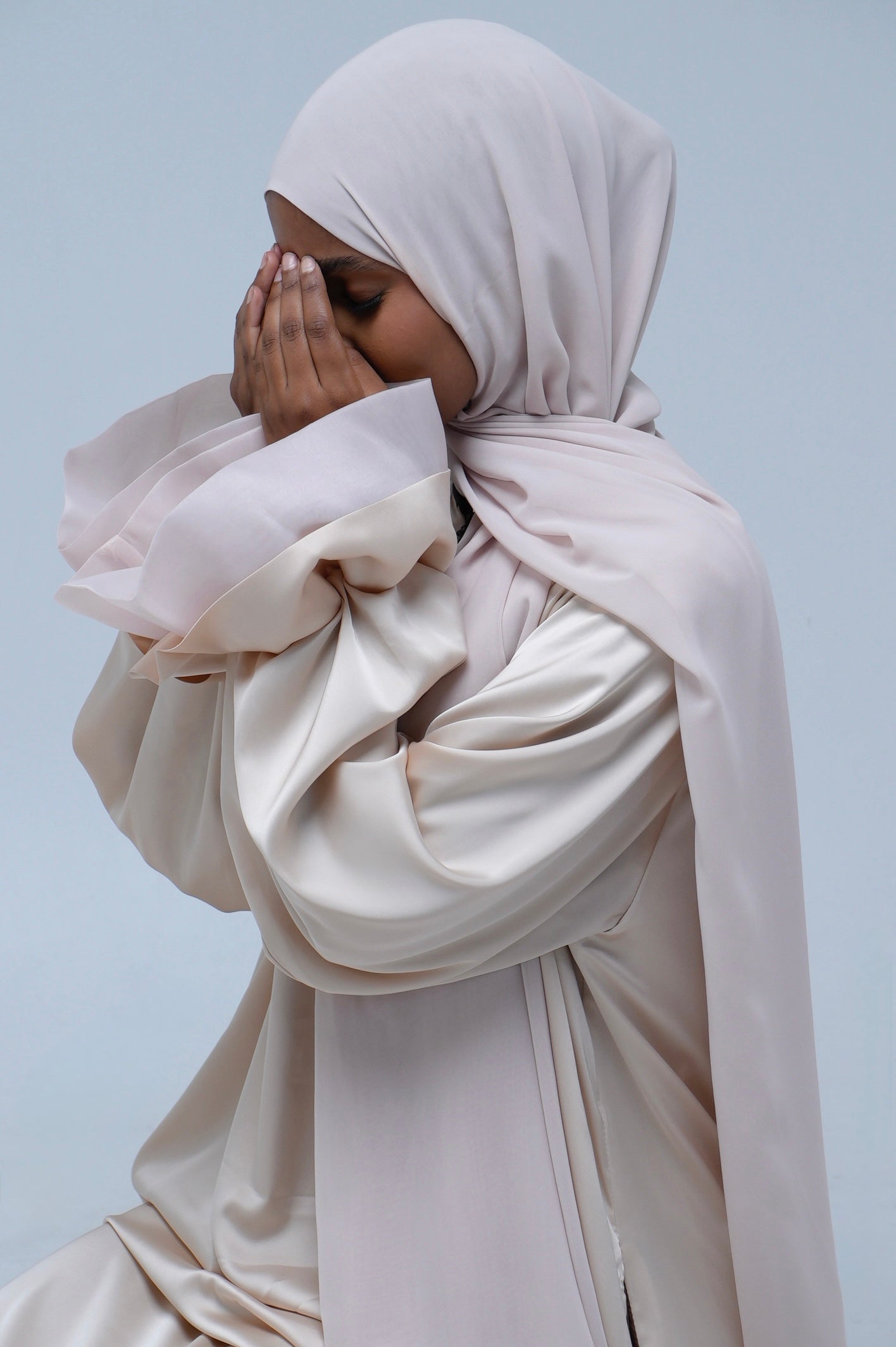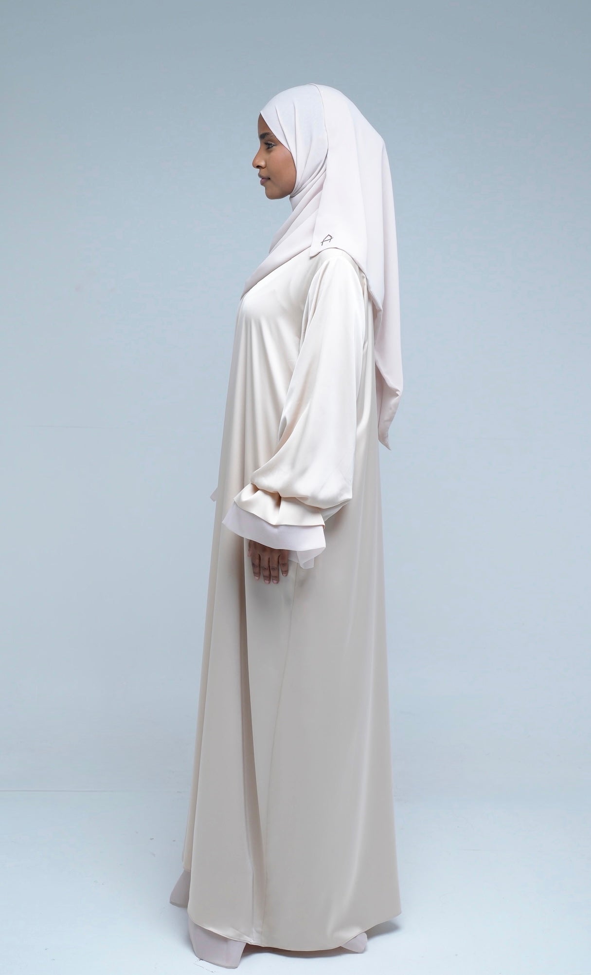 De cette rencontre intime est née la Robe du Rendez-Vous, une création façonnée pour unir la spiritualité et l’élégance. Évanescente dans son mouvement, elle déploie la douceur d’un satin Armani aux reflets subtils et la légèreté d’un organza italien délicat. En doublure, une mousseline fine et respirante insuffle aisance et fluidité, offrant un tombé qui ne colle jamais au corps.